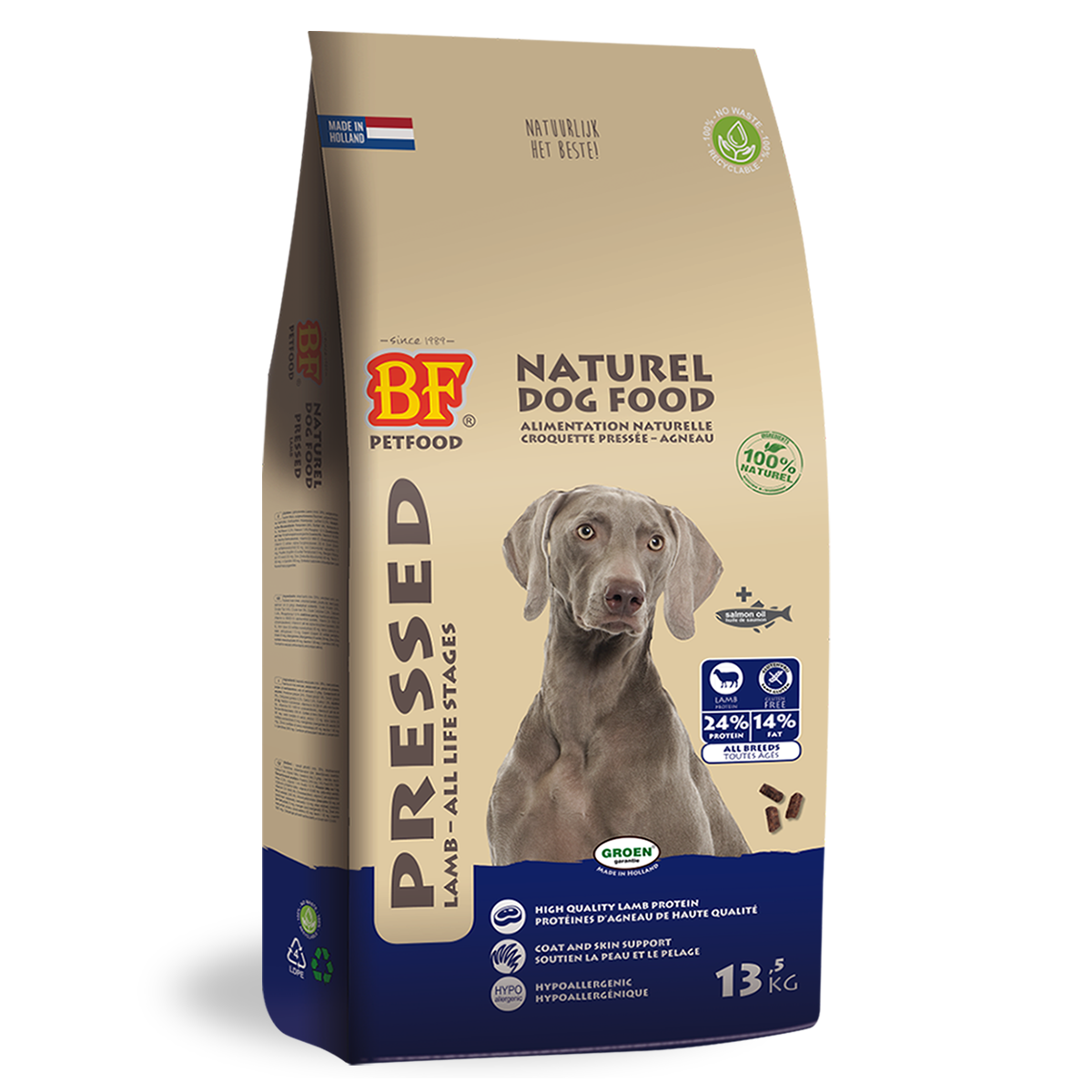 BF®Geperst Lam. Nederlandse topkwaliteit. Met hoogwaardige premium en natuurlijke grondstoffen. Volledige zeer goed verteerbare koud geperste all life stage hondenvoeding, geschikt van pup tot senior. Rijk aan lam (30%). Hypoallergeen (1 dierlijke eiwitbron: lam) en tarwe- en glutenvrij. Vezels ondersteunen de spijsvertering. Hoge acceptatie en verteerbaarheid. Voor voedingsgevoelige en/of kieskeurige honden en moeilijke eters. Ook geschikt voor drachtige en actieve honden. Lage maagbelasting en verhitting van de brok. Zonder chemische toevoegingen. Optimale voeding die zorgt voor een betere vertering, ontlasting en een goede conditie van uw hond. Voor alle hondenrassen en alle leeftijden.