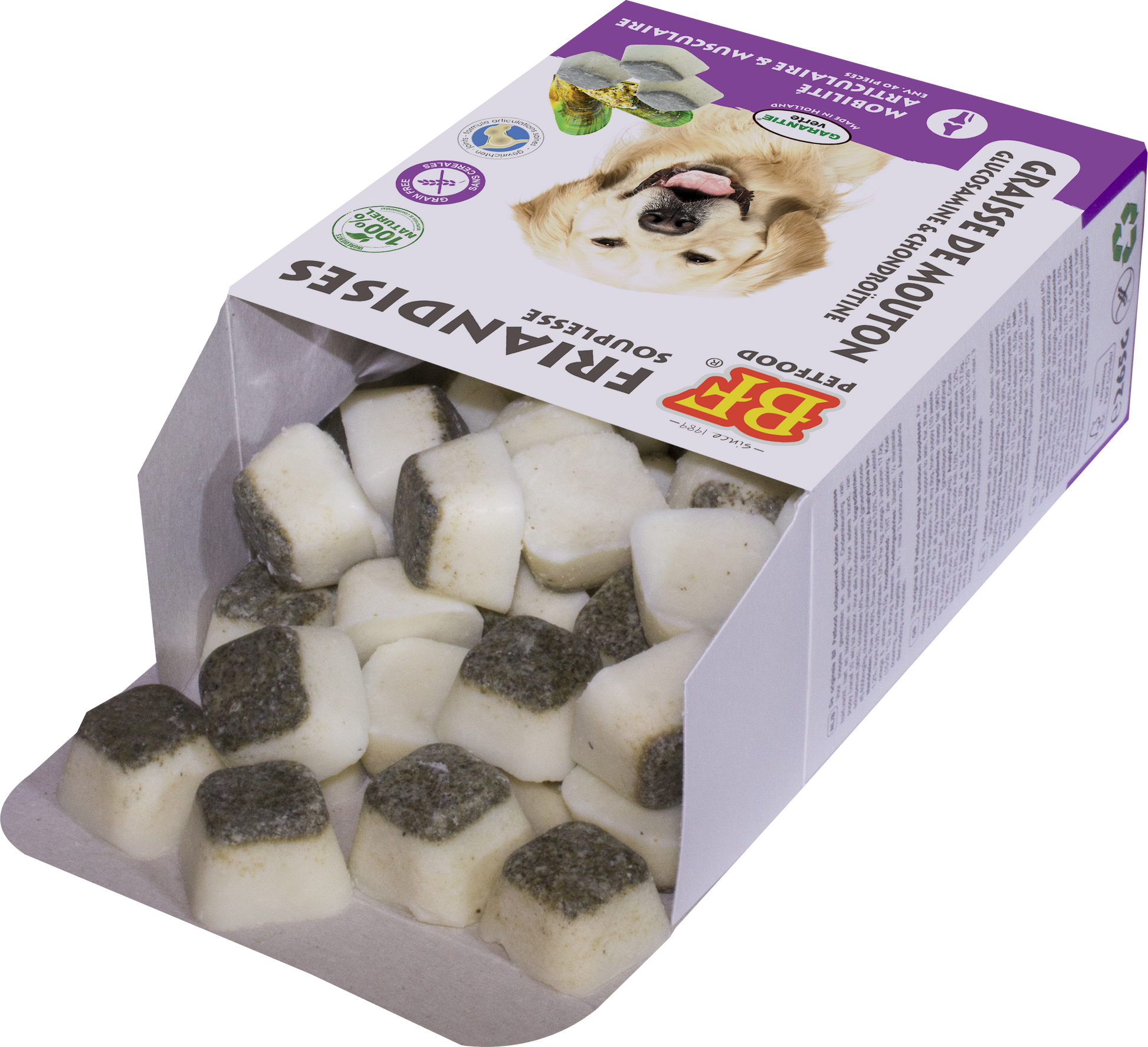 De originele BF® schapenvet bonbon Souplesse is een ware delicatesse voor iedere hond, van puppy (vanaf 10 wk) tot senior. Deze smaakvolle en gezonde Souplesse traktatie bevat een perfect uitgebalanceerde combinatie van gezonde ingrediënten: schapenvet en souplesse (chondroïtine uit viskraakbeen, glucosamine van groenlipmossel). Hoogwaardige eiwitten, aminozuren, vitaminen (A en D), omega 3 en 6 vetzuren, chondroïtine en glucosamine. Voor soepele gewrichten en spieren. Ondersteunt naast de mobiliteit ook huid, vacht, vertering en weerstand van grote, oudere en actieve honden en de groei van jonge honden.