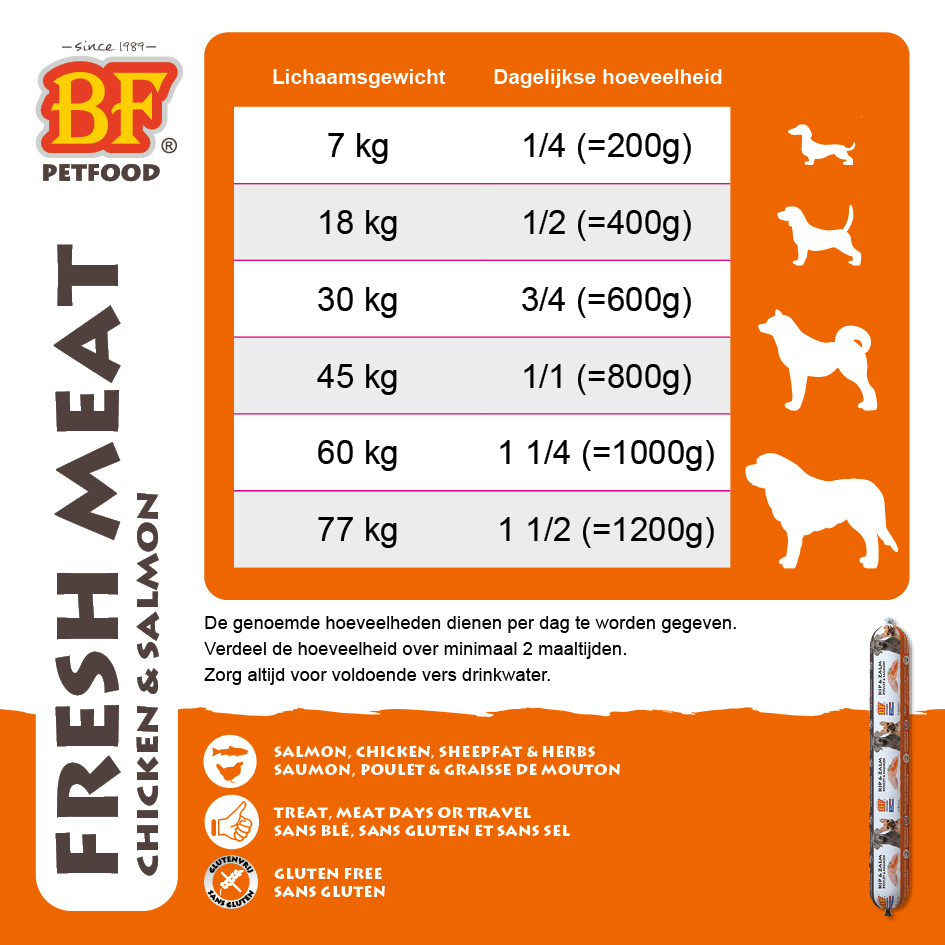 BF® Vleesvoeding kip/zalm. Complete en houdbare pure hondenvoeding op basis van vers vlees (kip en zalm), orgaanvlees, rijst, schapenvet en natuurkruiden. Glutenvrij recept. Onze vlees/vis maaltijden worden langzaam gestoomd met 100% verse en natuurlijke ingrediënten. Uitermate geschikt voor vleesdagen, als traktatie, voor onderweg, smaakmaker, bij omschakeling naar ander voer of voor honden die slecht reageren op droogvoeding. Handige 800g worst. Geschikt voor iedere hond, van pup tot senior.