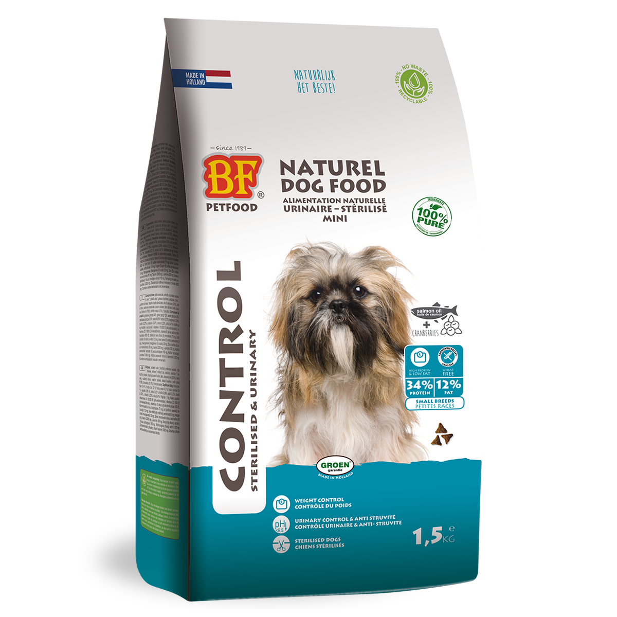 BF® Control mini is a high-quality, complete, tasty, and natural dog food for adult dogs of small breeds, overweight (e.g., due to spaying) and/or for urinary tract health (bladder grit/stones/struvite). It has a high animal protein content and a low fat......