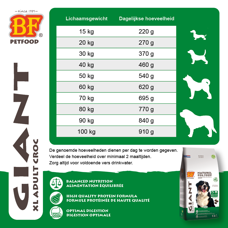 BF® Giant is a complete, easily digestible, premium, and very tasty natural dog food for large breeds and dogs that tend to gobble. It is highly accepted and digestible. It contains multiple animal proteins and supports mobility and joint health. Inulin FOS (prebiotics) stimulates intestinal flora and thus supports healthy digestion.......
