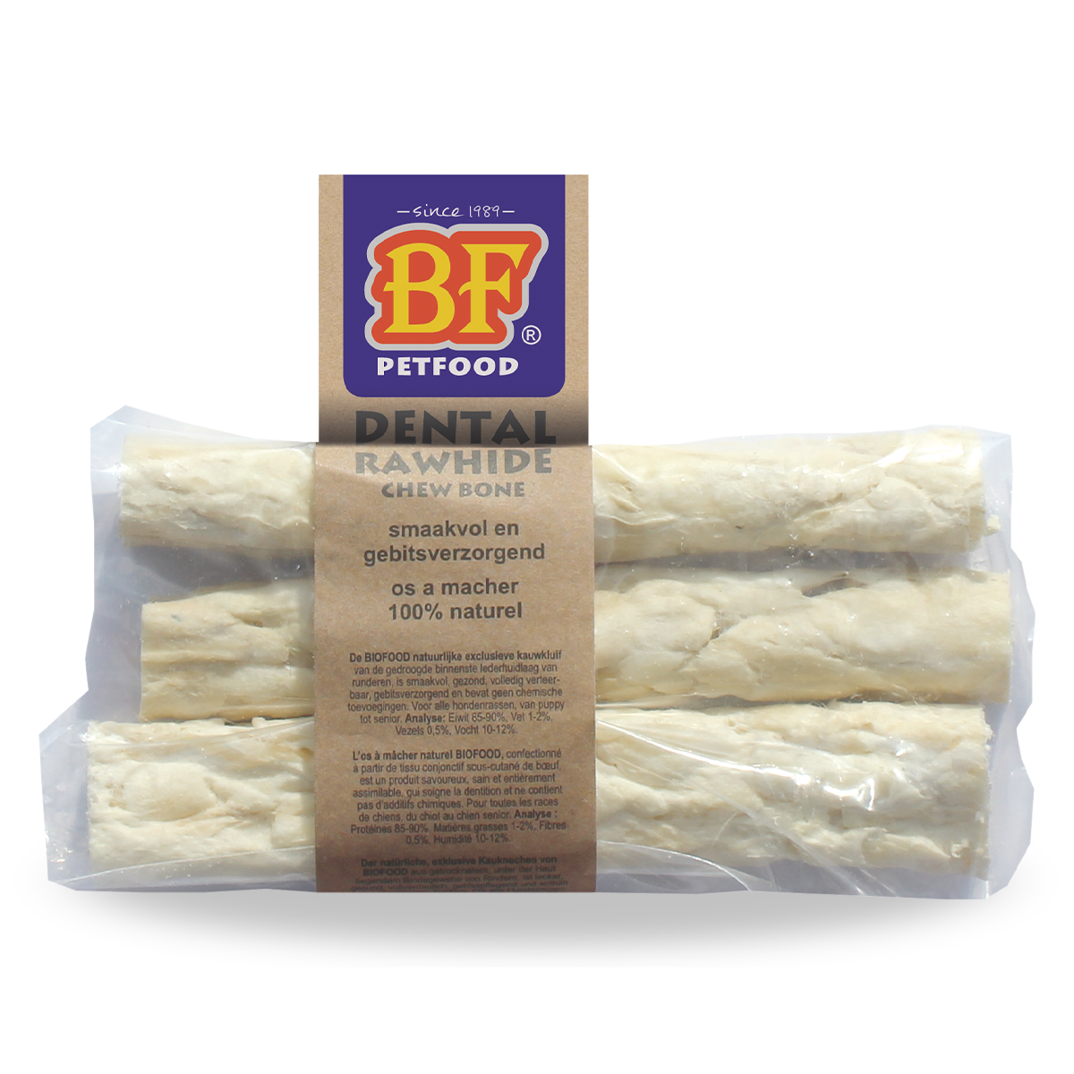 The BF® Rawhide Kaantjes Stick Dental chew bone works like a toothbrush, thanks to the constant and intensive abrasion between the chew bone and your dog's teeth. This provides optimal dental care, keeping your dog's teeth healthy and clean. Furthermore, BF® chew bones contain no chemical additives to enhance their appearance or taste. The tasty and healthy BF® chew bone provides your dog with long, enjoyable, and rewarding chewing pleasure.