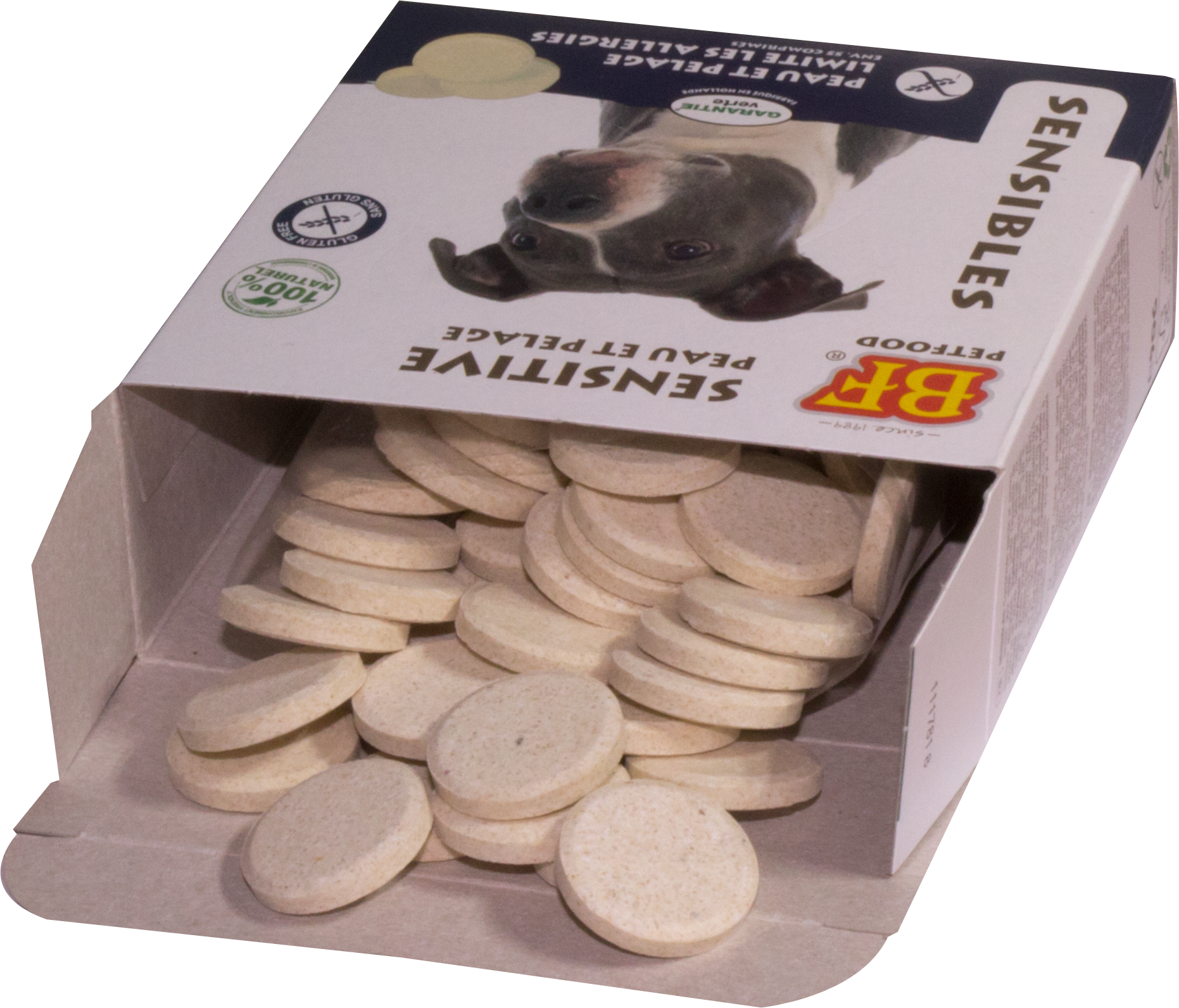 BF® Sensitive (hypoallergenic) natural yeast tablets for dogs, with amino acids, vitamins (A, B, D, and E), and minerals, contain tasty and healthy ingredients. They help reduce allergic reactions. Besides B vitamins (complex vitamins) and vitamin D, the (brewer's) yeast also contains high-quality and healthy amino acids, minerals, proteins, and enzymes. They support the skin, coat, and immune system. Suitable for all dog breeds.