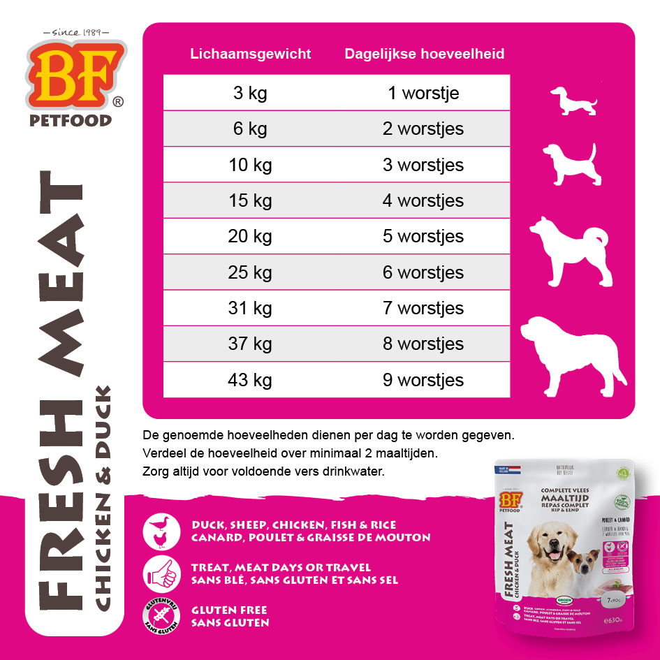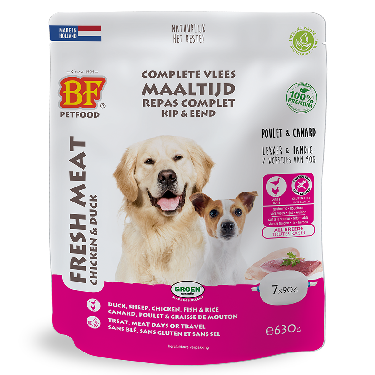 BF® Meat Food Chicken/Duck. Complete and long-lasting pure dog food based on fresh meat (duck, chicken, and fish), organ meat, rice, sheep fat, and natural herbs. Gluten-free. Our meat meals are slowly steamed with 100% fresh and natural ingredients. Ideal for meat days, as a treat, for on the go, as a seasoning, when switching to a different food, or for dogs that react poorly to dry food. With resealable packaging and convenient portion sizes (7x90g/630g). Suitable for all dogs, from puppies to seniors. Also available as 800g sausages.