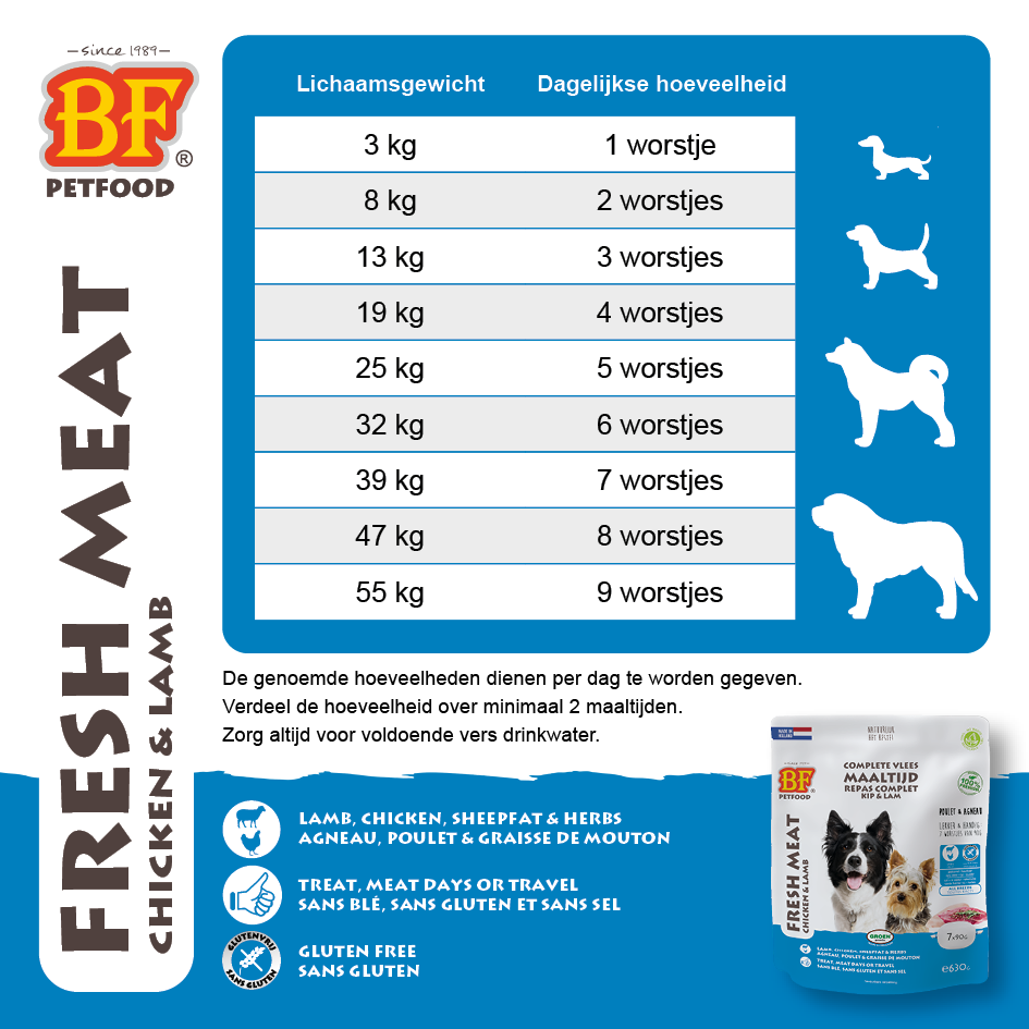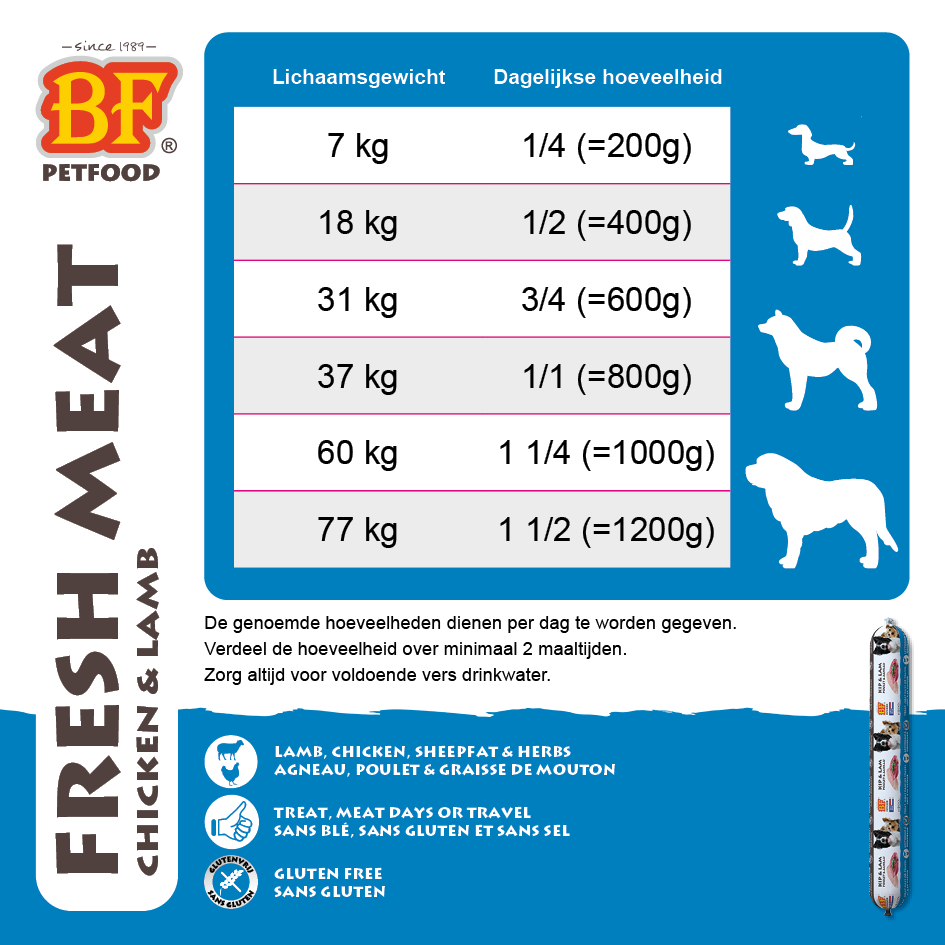 BF® Meat Food Chicken/Lamb. Complete and durable pure dog food based on fresh meat (lamb and chicken), organ meat, rice, sheep fat, and natural herbs. Gluten-free recipe. Our meat meals are slowly steamed with 100% fresh and natural ingredients. Ideal for meat days, as a treat, on the go, as a......