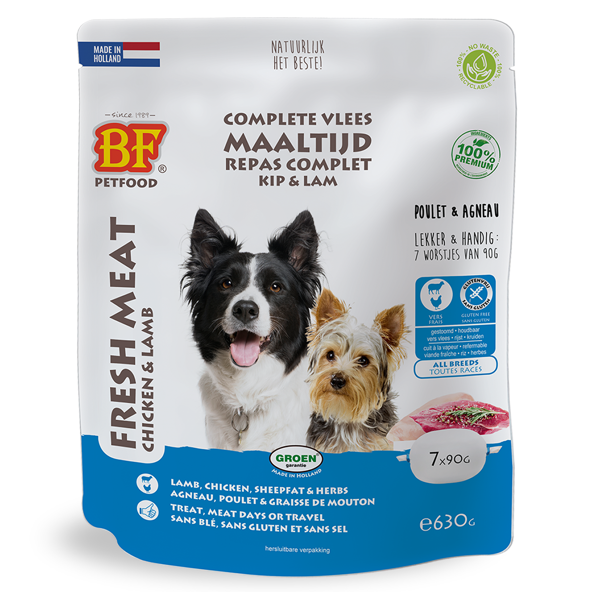 BF® Meat Food Chicken/Lamb. Complete and durable pure dog food based on fresh meat (lamb and chicken), organ meat, rice, sheep fat, and natural herbs. Gluten-free recipe. Our meat meals are slowly steamed with 100% fresh and natural ingredients. Ideal for meat days, as a treat, on the go, as a seasoning, when switching to a different food, or for dogs that react poorly to dry food. With resealable packaging and convenient portion sizes (7x90g/630g). Suitable for all dogs, from puppies to seniors. Also available as 800g sausages.