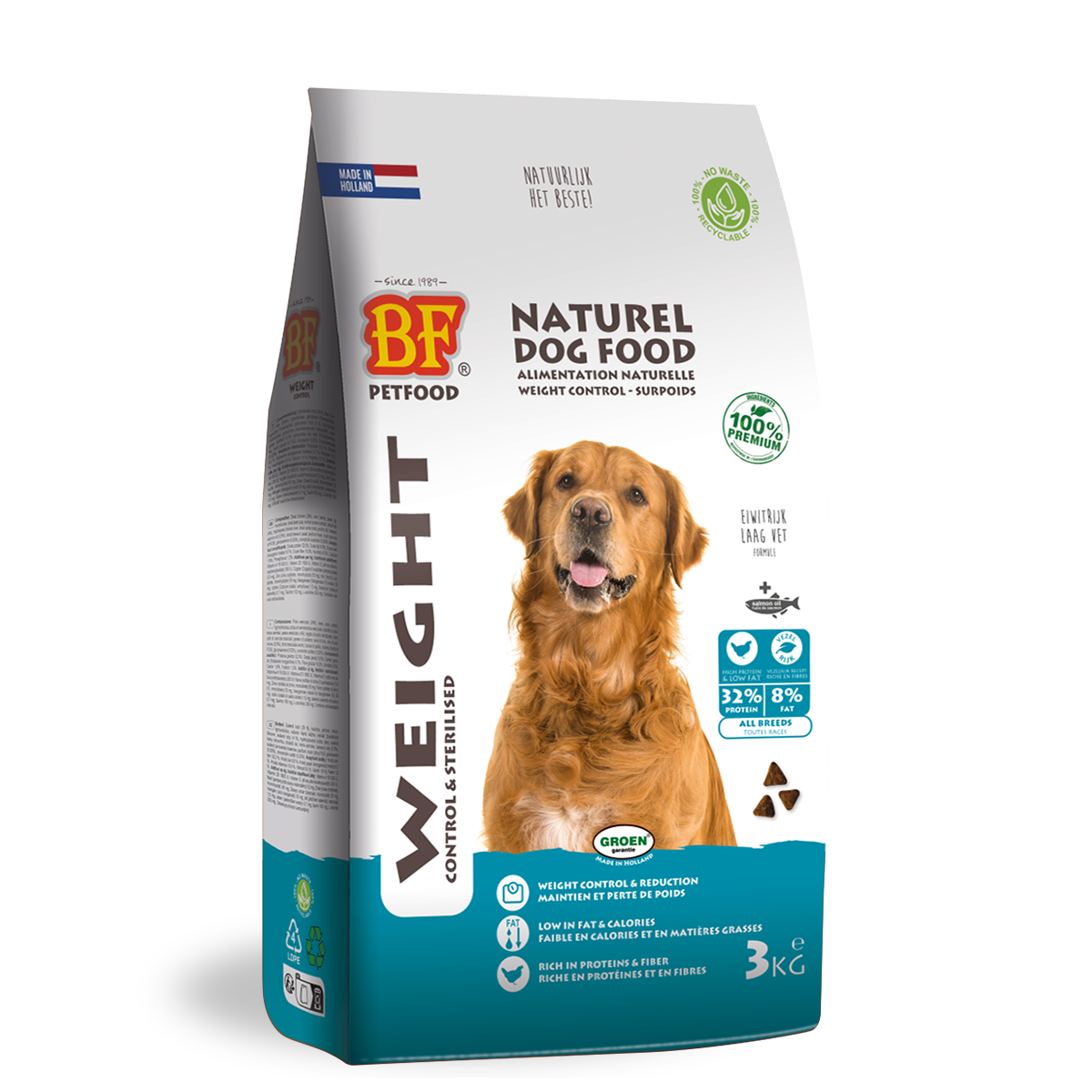 BF® Weight Control & Sterilized 32/8. A complete and delicious balanced food for adult dogs that are overweight or tend to gain weight (e.g., after sterilization). With a Weight Control & Sterilized formula: rich in protein (32%) and fiber, and low in calories and fat (8%). A high-protein recipe with chicken, along with salmon oil, glucosamine, chondroitin, L-carnitine, and fiber-rich grains with a lower GI index*. Wheat-free. Protein-rich food ensures that the body burns a lot of fat instead of lean body mass for weight loss and helps prevent muscle breakdown. Fiber provides a feeling of fullness (satiety), supports weight loss without the dog feeling hungry, and supports healthy, firm stools. L-Carnitine stimulates the burning of fat and protects muscles. Yeast, fiber, and prebiotics support digestion. The high acceptance of the food ensures that even the most fussy eaters will enjoy it. For optimal digestion and stool quality, and a healthy dog. Supports weight, mobility, skin and coat health, and natural defenses. For adult dogs.